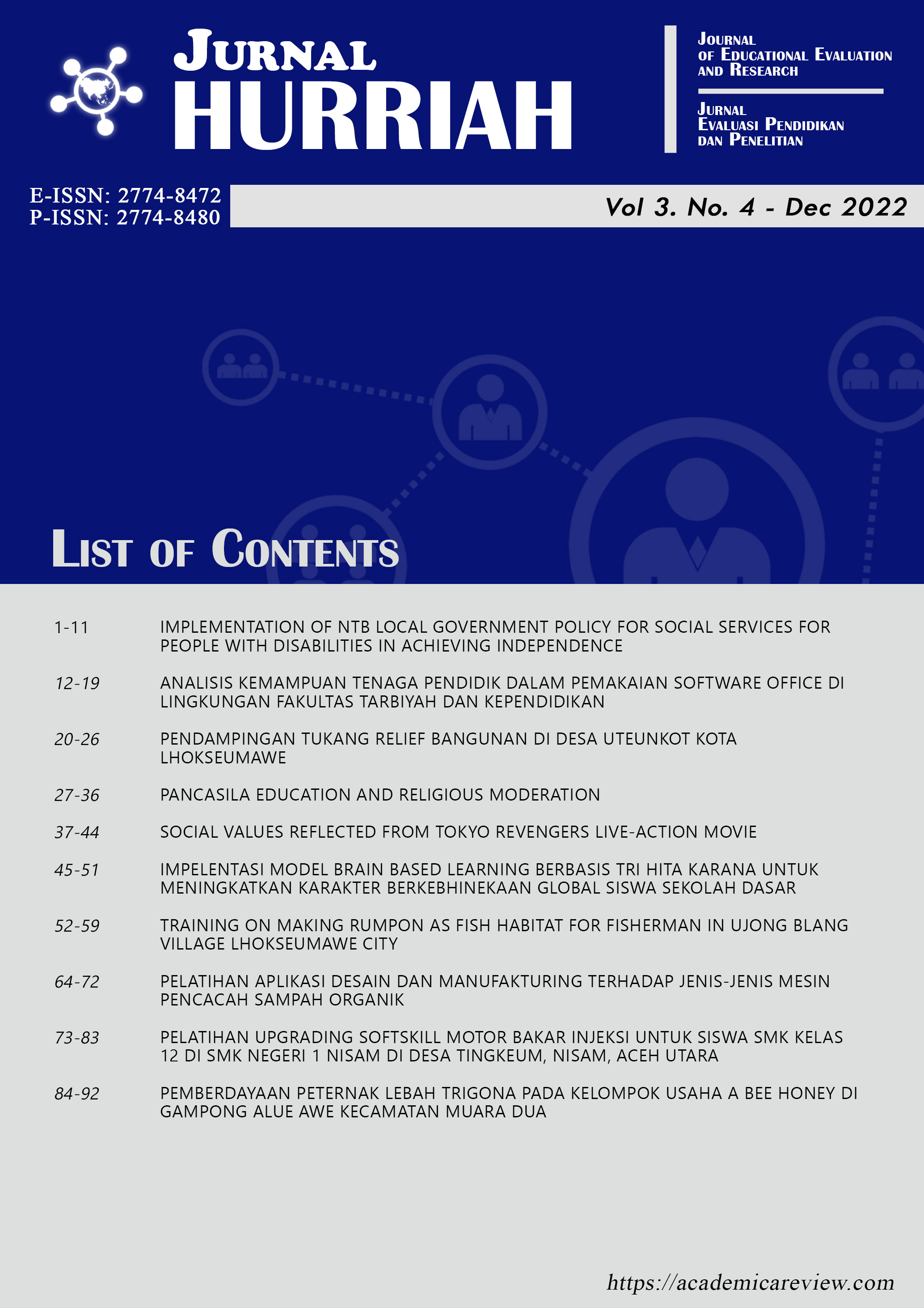 Vol. 4 No. 4 (2023)The covered topics in this issue including: Community empowerment, Utilization of ICT in learning, Islamic education and Cyberbullying prevention in school. This issue also inlcuding evaluation of practice in vocational education.