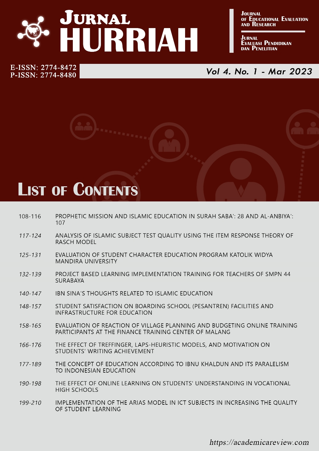 The covered topics in this issue including: Islamic education, online learning evaluation and education evaluation model to increase the satisfaction of students. -