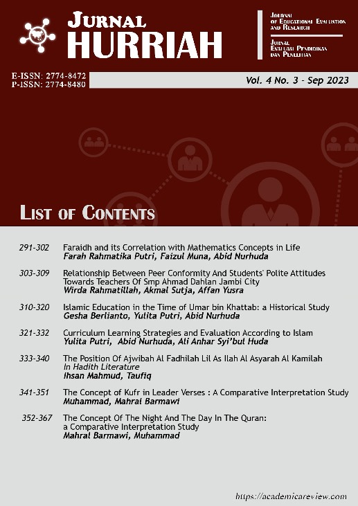 The covered topics in this issue including: faraidh and its correlation with mathematics concepts in life, relationship between peer conformity and students' polite attitudes towards teachers ,islamic education, curriculum, learning strategies, and evaluation according to islam, hadith literature, concept of kufr in leader verses,concept of the night and the day in the quran.